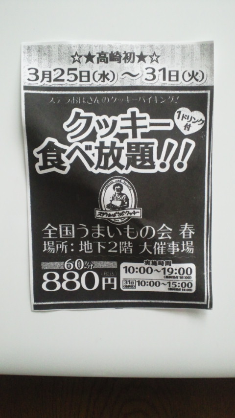 突然ではありますがとこはこの1月にママになりましたというわけで只今育児休業中です。我が子はかわいい(親バカで言っているわけではなく(苦笑))ですが子育てはやはり大変生後2か月が過ぎ散歩に出ても良い時期なのですが、花粉はピークだし風は強いしで赤ちゃんを連れだすには…と最近は家にこもりがち…てなわけで最近ストレスがたまってきましたそんな様子を見て旦那さんが「👶は俺が見てるからたまにはリフレッシュしてくれば」となんて優しい言葉てなわけでお言葉に甘えてクッキー食べ放題に行ってきました~60分食べ放題ですが、いた時間は30分かな~子どもが心配だったのもあるけど意外とクッキーってお腹にたまるからそんなに食べられなかったというのもあって…ちなみに高崎スズランの地下2階では他にも全国うまいもの会が開催されておりお弁当を買って家事も楽させてもらいました~たった2時間のですが久々の外出優しい旦那に感謝です