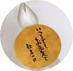 金色の和柄に「いつまでもお元気で 敬老の日」と入ったリボンシールをお付けしてお届け。