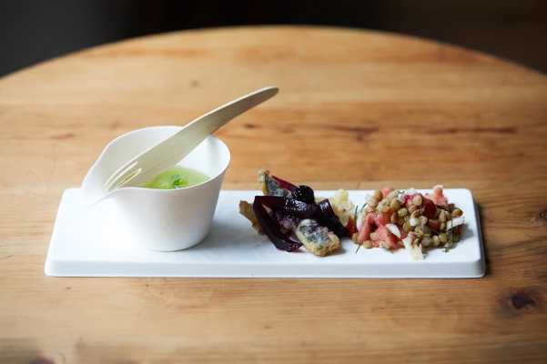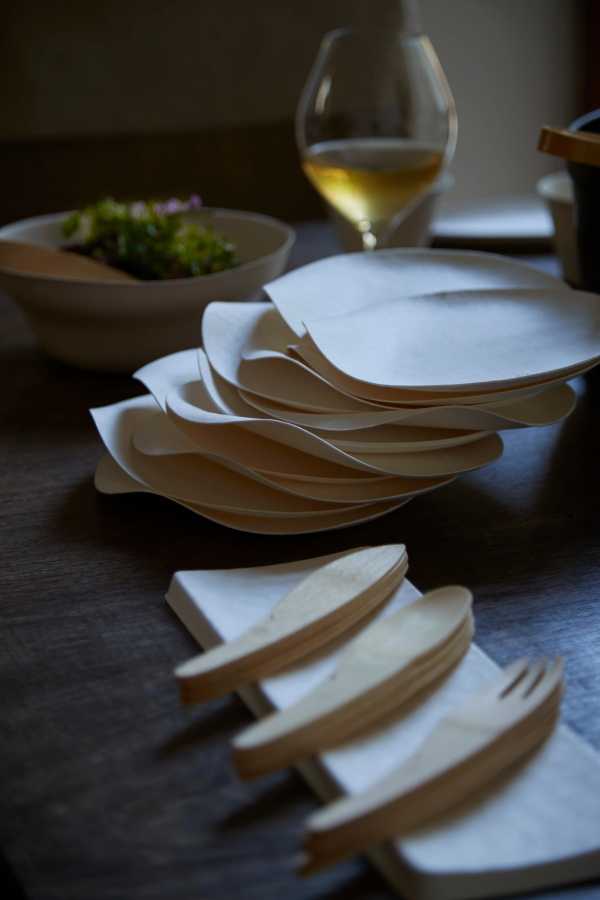 竹製カトラリーはお皿に引っかけられるデザインで、