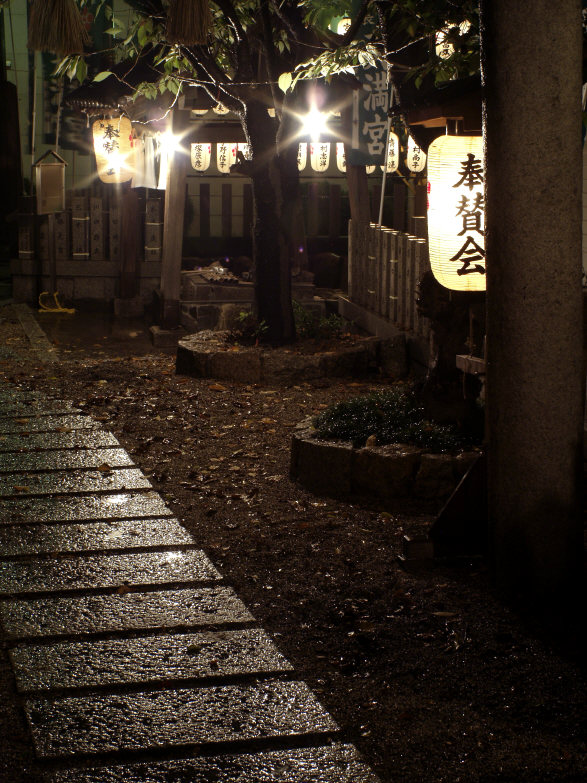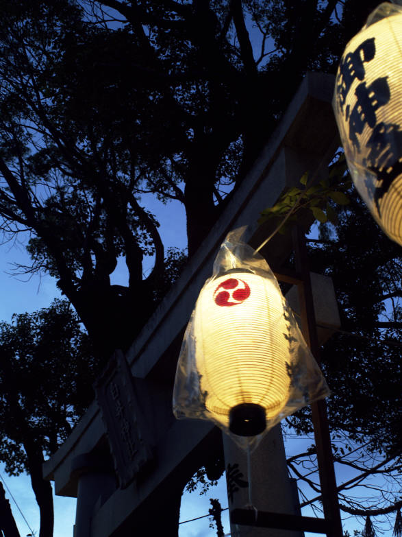 夜中にファックスをしにコンビニへ。 おわって途中に堤燈の賑やかな列。 行って戻って・・・行って戻って・・・車を停めた。 境内には、神輿が居らっしゃった。 雨の所為でか、人が一人もいない。 深夜1時半、神輿様と一対一になる。 多分、生涯に一度有るか無いかのチャンスである。 気が付くと4時前。 小さなビニール傘だったので、腰から下はびしょぬれとなった。
