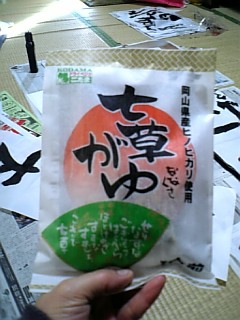 なんともはや・・・。書初めは学校から清書用に用紙を2枚もらってきている、との話だったんだけど、まさか2枚じゃあ満足いくものは書けないよね?ということで年末に書き初め用に半紙を購入してあったんだけど(ん?長いのも半紙っていうんだっけ?)どうも指定の大きさよりも小さかったんですよ。なのでそれを練習用にして、学校から持ってきた用紙に清書しようね、ということにしていたのに、今になって用紙が見つからない、ときたもんだ。おいおいおい、捨ててないならあるはずでしょうが!しかも見本も無いと来たもんだ。見本が無いってどういうこと?お手本ナシでどうやって書くのさ!?しょうがなくワードでそれらしく印字したものと私の拙い指導でやっとこさ書き初めに着手。なんとか書きました・・・。この七草粥のパッケージの後ろに写っているのが書初めでございます。お昼は炊き込みご飯と野菜炒め・・・。の、前に、この七草粥(どーせ食べないからと思って最初から1人前だけ買ってみた)のいわくを説明したりして、まあ味見程度に食べてみた。私には案外おいしく感じられたけど、次男コーヤだけは食べなかったなあ・・・。午後は予告どおり映画会に参加。いやあ・・・結構おもしろかったですわ。子どもたちも大うけ。どんぐりを追うリスがよかったし、全体的にCGもよかったですよ。動物の動きなんかも本当によく研究してあるなあと・・・。こういうのはやっぱり大きい画面で見ないとね。・・・って、無料だから評価が甘いかも!?夕方、まだやっていないプリントをやるように言ったら・・・なんと見つからないのだ。年末に途中まで色塗りをしたのを私も見ていたのに。いったいどこにやっちゃったの?まだゴミの日は来ていないし、絶対に家の中にあるはずだよね?もう知らないよ~!もうすぐ6年生になるというのに困ったもんだ。明日の朝のうちに見つからなかったら、誰かまだやっていなさそうな(!)友達の家に電話してコピーさせてもらって来い!と叱りつけちゃったけど、果たしてそんなやり方が吉と出るのか出ないのか?なんだか1日中怒っている私。だからしわも増えるし白髪も増えるんじゃないのか今日は近所のドラッグストアでを買ってみた(だって300円ぐらいだよ!)。そのうち結構明るい茶髪になる予定。あ~あ、次こそは美容院で染めようと思っていたのに・・・貧乏性な私だなあ。