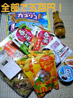近所のスーパーでは、時折、売れ行きがあんまり芳しくないものや賞味期限が迫ったもの・季節モノなどをセットにして透明な袋に入れて500円で販売する、という事をしているようだ。「ようだ」というのはスターウォーズに出てくるあれじゃなくって(違うだろ!!!って。ひとり突っ込み・ひとりボケか・・・失礼しました)、「ようだ」というのは、そのスーパーには閉店間際などに行くことが多いので、なかなかお目にかからないわけです。夏の終わりには炊き込みご飯の素が何種類かと、ババロアの素などが入った、その寄せ集め商品を購入して悦に入っていた私。今日はこんなものを購入しました。缶詰が2個(鯖の水煮缶大好き!←我ながら味覚が貧乏性)右上のオレンジジュースのようなものはヨーグルトにかけるマンゴーソース(ちょっと微妙?)カプリコ20個入り(これは子どもたちのおやつにちょうどいいな)マンゴーチップ2袋そしてこれが時期が過ぎちゃった商品と思われるマカロニ。シーズン中は結構高価な値がついてエンド部分に並べてあった気がする。そして、こちらは昨日までで時期はずれになっちゃった商品ですね。特に下の二つ。でも我が家ではこれを見た長男ゲンが大喜び!彼は朝ごはんにお茶漬けを食べるのが大好きだからです♪お店としては「在庫処分品」だったと思うけど、私にとっては(我が家にとっては)福袋だ~♪しかも!今日はちょうど行った時間が半額シールを貼るタイミングだったんでしょうね。子持ちカレイの切り身・ひずなますを作ってと言わんばかりの鮭のあら・煮アナゴのカットされたもの等々を半額でゲット!そういうわけで今晩の献立は・子持ちカレイの煮付け(4切れで200円!)・チラシ寿司(寿司飯の上にいり卵・上記の半額アナゴ~100円だよん~・インゲンをのせました~)・大根サラダ・納豆と山芋と浅葱でねばねば小鉢というような晩ごはんでした~。そしてデザートに「お好みケーキ」。これは市販のカステラに、家にあるフルーツや生クリームを各自で飾り付けて食べる、という我が家ではお子様大喜びのデザート。ま、お正月最後ということで・・・。子どもたち、明日から学校だぁ~!寝坊するなよぉ!(しばらくはお弁当5つ作る生活だぁ!私こそ寝坊厳禁!)