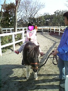 市内にある歴史公園(という名称ではないけど)で、今日「餅つき大会」があるとのこと。市の公報に載っていたので、子どもたちに声をかけると興味がありそうな感じ。先着何名、って書いてあるけど、たぶんいっぱいにはならないでしょう(希望的観測)。洗濯・上履き洗いを済ませて「みんな~!行くよ~!」と声をかけると長男ゲン「僕行かない」次男コーヤ「僕もいい」長女シオリ「行く~♪」おいおい、2対1ですか?ゲンのみなら置いていってもいいけど、コーヤとゲンの二人を置いていくのは心配。かといって、シオリは出かけたがっているし。「なんで~?餅つきしたいって言ってたじゃん?」と聞くと「もうやったからいいし~」って、長男ゲン。確かに年末にキャンプ場でやりましたけどねぇ。ゲームがやりたいだけなんじゃないの結局あまり長い時間子どもたちを置いていくが不安なので餅つきへの参加は断念。代わりに近所の公園へ。ここなら兄ちゃんたちも時々付いてくるのに、やっぱり出かけるのはシオリのみ。パパがいれば違うんだろうけどなあ。ま、いいか。シオリと二人でしばしドライブ。近くの公園は、ポニー乗り場があったり(1回100円)、ミニ動物園があったり(モルモットをだっこできます。ウサギや山羊にニンジンの餌をやることができます。ニンジン100円)、遊具もあるし、アスレチックはあるし・・・というところなので、お手軽レジャーにぴったりなのです。兄ちゃんたちがシオリの年頃には絶対やらなかったポニー乗り、最近のシオリは「公園に行ったら乗るもの」と思っている様子。↑ご満悦のシオリ というわけで公園遊びを満喫して帰ってきました。たまには「ママとべったり公園遊び」もしなくちゃね。シオリと二人きりなんて・・・めったにないしね。実はこの間に自宅では事件があったのですが・・・それはまたあとで。