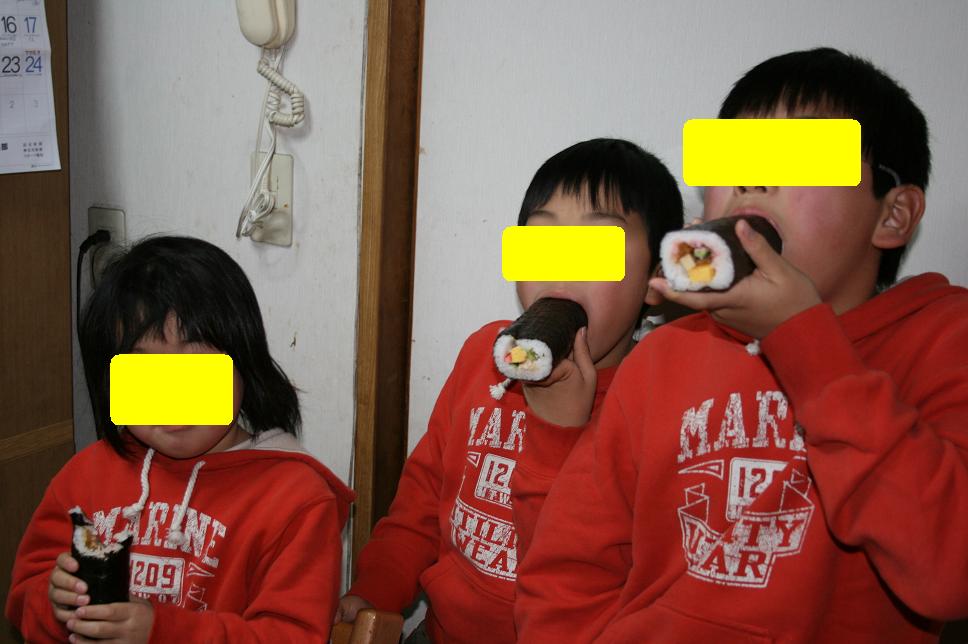 数年前までは関西地方の風習だったのに、あっという間に(コンビニの策略?)全国区になった「節分の丸かぶり寿司」。知人のノルマ達成に一役買うために、去年も今年もお店で家族の人数分を購入!オマケでお茶やお面や豆ももらうし、ま、準備も簡単でいいですね。今年は、ふつうのを3本とサラダ巻きを2本にしたんだけど、ふつうの方が美味しそうだったなあ・・・。さて、北北西はあっちだよ~、ということで食べ始める。一言も口をきかないで食べ終わるというのは難しいけど、なんと、ゲンはもちろんのこ、コーヤまで1本完食!シオリももう一息でした。去年はシオリは半分ぐらいしか食べられなかったんだから、それを考えると成長ぶりがうかがえます。三人おそろいの洋服を着せてみました♪