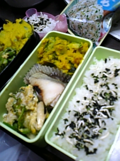 本日のお弁当のポイントは、ご飯を炊くときに一緒に加熱したかぼちゃで作ったかぼちゃサラダ。キュウリ入り♪真ん中のお魚はネットで購入した「レンジで焼き色がつく魚」です。手前はキノコとピーマンの炒め物の卵とじ。ふりかけはしらすのふりかけでした~。かぼちゃサラダはちょっと多めにできましたので、子どもの朝ご飯のサンドイッチの具になりました♪