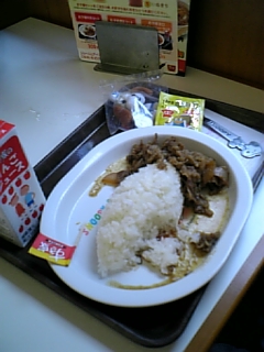 先日の台風の影響で、とある有料道路が一部通行不可になり、周辺道路が混雑しているので、近くといえば近くの、別の有料道路をしばらくの間(直るまで?)通行無料にするというニュースを聞いたので、早速ホームページで確認し、夫に提案。「ドライブに行こう!」その無料になった方の有料道路の終点近くにある博物館は、我が家のお気に入りの場所なのです(割引券も持ってるぞ!)。ここ数年、年に数回ペースで行っているのだけれど、行く度に興味の対象も異なっていたり、あるいは何度も見たのに初めて発見することがあったり・・・。三連休初日で混雑を警戒したけれど、さほどの混雑もなく、お目当ての「インタラクティブクイズ」もできました。コレはクイズを映画館のような座席で見るのですが、クイズの解答を座席のスイッチで選び、会場の多数決で物語が進んでいく、というものです。いくつかのストーリーがあるのですが、もちろん我が家の選んだ物がいつも多数決で勝てるとは限らず、「またこの問題・・・」とガッカリするときもあったのですが、今日は希望どおり!幸い、クイズも全問正解でハッピーエンドになりまして、いい気分で帰宅。帰りには「すきや」で牛丼をば。シオリはお子様メニューを、他の4人はそれぞれ大人のメニューを、みんな完食! 写真取る前に一口食べられちゃった・・・。 こうやってみると結構ご飯もたっぷりだよね。コレにジュースとアイスとおまけがついて300円ぐらい?シオリ大満足でした。でも、指人形は第一希望の女の子っぽい犬のキャラが品切れで、普通のわんこの指人形をチョイス!ぐずるかなと思ったけど案外気持ちもすぐ切り替えて、おぬし、大人になったのぉ・・・。帰ったら指人形で「おうちごっこ」しよっか?