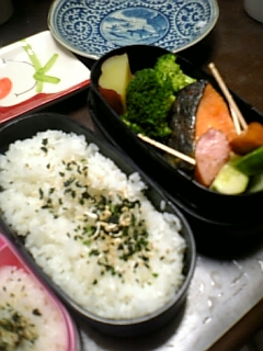お弁当って毎日作っているとそんなに苦にならないのに、ちょっとご無沙汰すると一気に面倒くさくなっちゃったりしてしまいます。ましてや飲み会の翌日では・・・。でも気を取り直して今日も今日とてお弁当~。本日のおかずは、・サツマイモ(ご飯を炊くときにアルミ箔に包んで一緒にふかしちゃう)・ブロッコリ(塩湯でしたあとにドレッシングを絡めました)・鮭の西京漬け(アルミ箔をひいてオーブントースターで焼けば洗い物が少なくて済む!)・ウインナとキューリ今日は我ながら味のメリハリもついていてよかったですわ♪でもウインナキューリもブロッコリも本来(というか通常の我が家では)隙間うめメニューなのに、週の初めから乱立しちゃって大丈夫!?