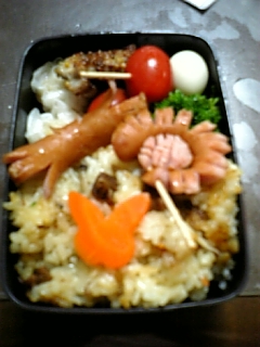 前日からの空模様も、天気予報も、何を見たって聞いたって、この日の運動会は無理でしょうねえ。なので何の準備もしないで就寝し、でも枕元の携帯がメール配信を告げました。そう、昨日に引き続き、今日も緊急連絡網はメール配信。当然中止です・・・。しかし、今日は「雨なら月曜日の日程で登校」なのです。近隣の学校でもいろいろやり方があって・雨でも晴れでもとりあえず土日は両方出て月火はもともと休み、運動会は水曜以降・雨なら土日は両方休みで月曜日に運動会などなど・・・。うちの小学校は間を取って?日曜は登校ということで・・・ということは・・・そう、給食がないからお弁当が必要ということ。そして来たるべき本番の運動会(火曜日?それとも水曜以降?)は、給食があるからお弁当は持って行かなくていいということ。テンション上がらないけど、お弁当作りました。兄ちゃんズは早々に出かけちゃったので、シオリ用に作ったお弁当を披露。わかりますかねえ?3個作ったうち上手くできたのを兄ちゃんズに入れたので、シオリの自宅用(!)弁当のひまわりウインナはちょっと形が崩れ気味でした。かえってきた兄ちゃんズには飾り切りのウサギニンジンが好評でした。リンゴを剥く元気がなくてすまなかったねえ。ミカンもあったんだけどねえ。でもまあ来年のお弁当はちゃんとがんばるよ・・・って、しまった~、長男ゲンにとっては来年はもう無いンじゃん!中学校はこの辺では親とは食べないみたいなのです。まあ、それも助かるといえば助かりますが・・・。
