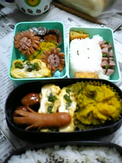 今日は小学生はお休み。保育園児は普通どおり。もちろん親も普通どおり。というわけで、パパは7時に出勤、私は8時にシオリを連れて保育園経由で出勤、コーヤも一緒に8時に家を出て学童保育へ・・・のはずが、休みとわかっているとコーヤが出かける準備を一向にしないわけでして!!!結局、その「家庭内渋滞」のために私がもう遅刻ギリギリの時間になってしまい、保育園へ送りに行くのは長男ゲンに依頼しちゃいました。職場に着いてから自宅に電話。何でコーヤが出るかなあ!?とりあえずゲンはシオリを送りに行っているようで・・・。コーヤもゲンが帰ってきたら学童保育に行くというので一安心。さて、明日は天気次第で運動会。上司に「雨が降ったら来ますけど、「晴れたら休み」でもいいですか(汗)」と相談。一応快諾(!)してもらって一安心。月初なのでいろいろ揃える書類があって大忙しの1日でした。一応お弁当をアップしますね。わかりますかねえ?薄緑のお弁当箱に入っている「モンスターボール風」のもの・・・。このような「キャラ弁風」のものを作ったことって無かったので、こんなものでもお子様大喜び。ひまわりウインナも3回目ともなると、スムーズに作れましたとさ♪