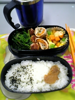 コーヤのピアノ発表会まであと数日・・・しかし気分屋のコーヤ、練習もやったりやらなかったりできていたところも気が乗らない練習ではもうメタメタ・・・つっかえちゃったらそのまま流して弾くように言われているのに戻って弾きなおしてしまう・・・orz弾けないところはゆっくりで、得意なところになると早弾きになっちゃうというかっこ悪さ!本番のことを考えると眩暈が襲ってきます。レッスン日ではないのに発表会の前日は見ていただくことになってしまいました。先生もさぞや心配でしょう・・・。 で、それはそれとして本日のお弁当 ほうれん草+オカカ・ウインナ・エノキとニンジンの肉巻き・ミックスベジタブルのチーズ焼き、であります。先日、某掲示板でお弁当の作り方の話題が盛り上がっていましてね、その中に「とりあえず寝る前になんか巻いておけ!」というのがありましていわく、牛肉に三度豆ですき焼きのタレで味付けする、豚肉にモヤシで厄前に片栗粉を振って焼き肉のタレで味付け、アスパラベーコン・・・等々。そういえばそういうおかずを最近作っていないなあと思ってここ数日は「巻物」のバリエーション。本日は「豚ロースの中身がエノキとニンジン」味付けはシンプルにクレイジーソルトのみ。クレイジーソルト 30gここんとこ同様に、中身を冷凍スジなしインゲンとか、「冷凍スジなしインゲン+ニンジン」などもやってました。お弁当レシピ見ていると「ハムとスライスチーズ(さらに海苔とかも)」「ウインナーのベーコン巻き」等というのもあるので、しばらくは「巻物」研究を続けて来年中学生になるゲンのお弁当生活に生かしますぞ~。+まりもん+