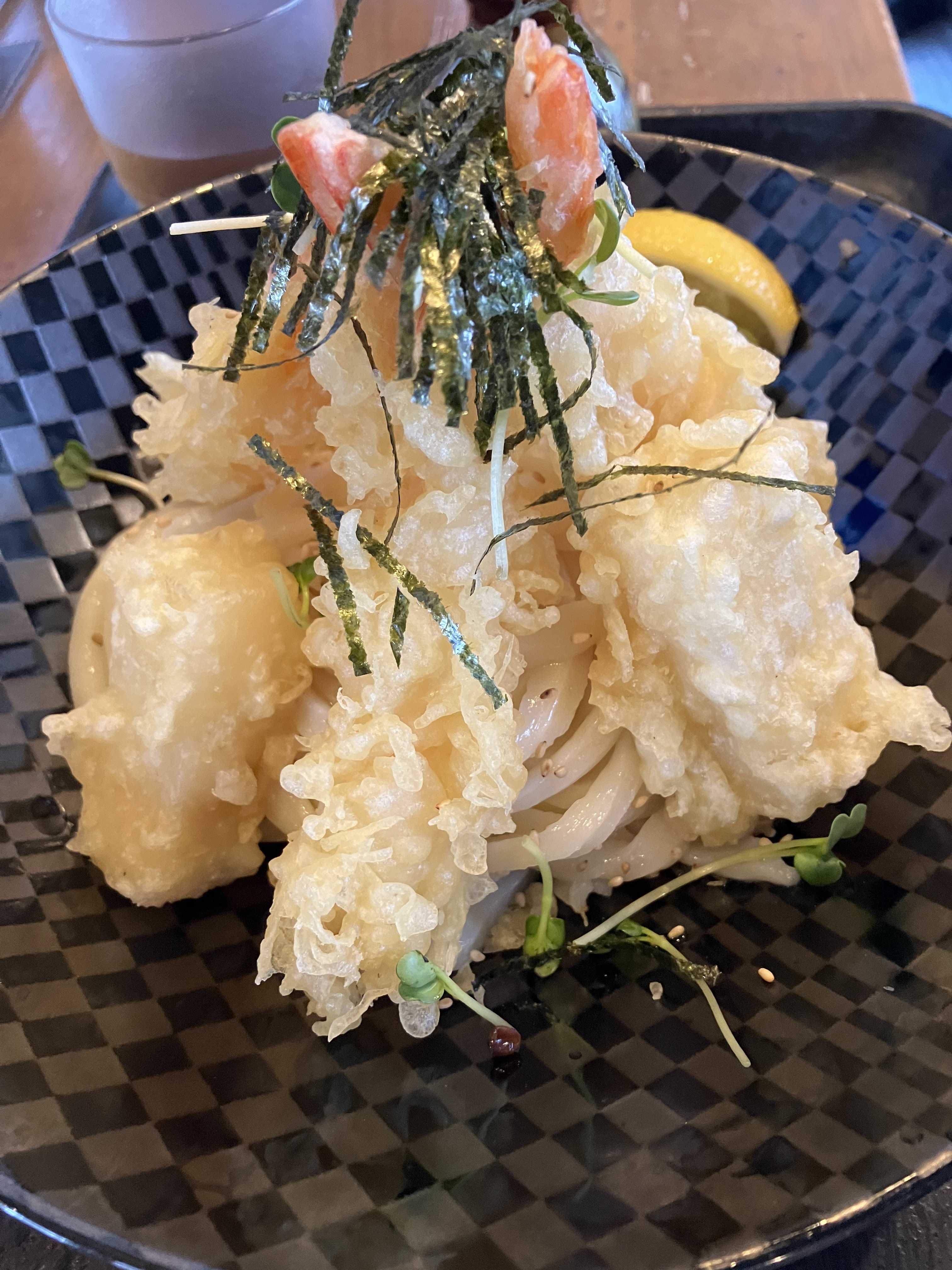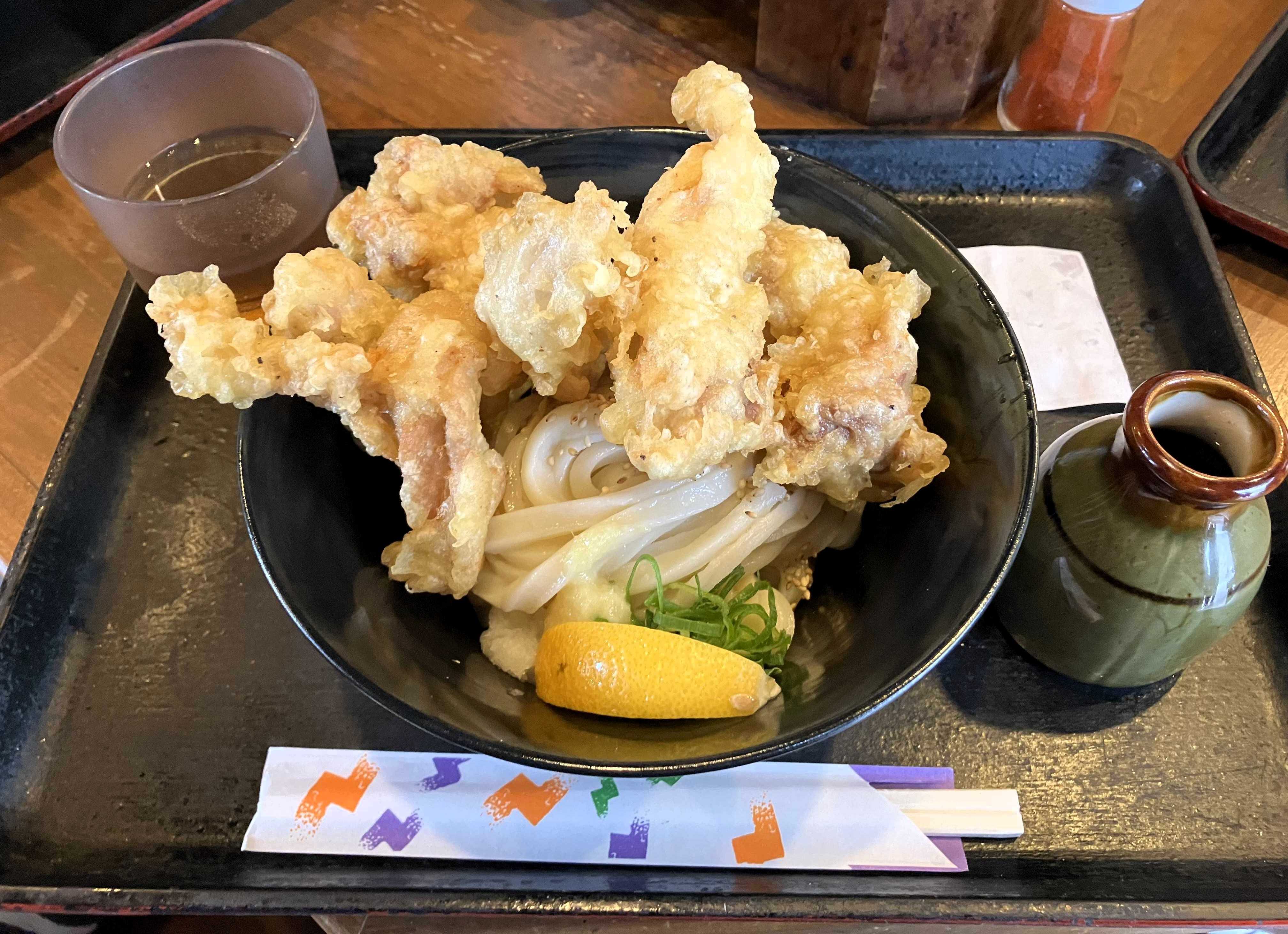 えび天2個と野菜天がついてお得。妻は、かしわ天ぶっかけを頼みました。暑い時期は冷たいうどんがいい。