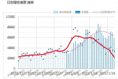 一ヶ月ほど前に見た、googleの感染者予測の答え合わせをしてみましょう。https://plaza.rakuten.co.jp/spectra/diary/202101050000/まずは全国。google予測の数値データファイルが行方不明になってしまったので、グラフの画像の上に重ねてみました。見難くてスミマセン。横軸は日付で、2020年12月7日が左端、2021年1月31日が右端になっています。青丸は2021/1/31現在の実際の感染者(つまり、答え)です。それに7日間の移動平均をかけたものが太赤線です。棒グラフはgoogle感染者予測で、12月末まで(グラフの左半分、色の薄い棒グラフ)は実際の感染者数データと同じです。予測された部分は右半分(棒グラフの濃い部分)です。細い紫線はgoogle予測の7日間移動平均です。(私とgoogleの移動平均計算法が違うようで一致しませんが、大勢は同じ)つまり比較すべきは、グラフ右半分の色の濃い棒グラフと青丸です。結果から言うと、当たらずしも遠からず、って感じですね。1月に大幅に増えるということは当たっています。1週間ごとに来る極小と極大も、概ね似たような傾向を再現しています。しかし感染者数のピークが1月下旬になるという予測に対し、実際は1月上旬でした。特に、1月後半に感染者数が減っているのは、緊急事態宣言が効いているんじゃないかと言う気もしますね。まあgoogleの外挿モデルがどこまで正しいかっていう話ですが。東京の方は、ピーク予測もずれたし、絶対数もかなり過大評価だったみたいですね。それなりに色々対策したのが効いているのでしょう、と思いたいね。全くハズレと言っても良いのが群馬県。他の都府県同様、年末年始の休みで感染者数が増えた感じですね。そもそもなぜ、年末年始を経て感染者数が減るという予測だったのだろう?そこまで秘境じゃないと思うぞ。おもしろTシャツ 魔境グンマー ギフト プレゼント 面白 メンズ 半袖 無地 漢字 雑貨 名言 パロディ 文字2月頭時点での予測を見ると、この先しばらくは漸減するようです。https://datastudio.google.com/u/0/reporting/8224d512-a76e-4d38-91c1-935ba119eb8f/page/ncZpB?s=nXbF2P6La2MPCR検査なんてやっている限りゼロになることはもうないと思いますが、いいかげん緊急事態宣言なんてさっさとやめて欲しいわ。いつになったら収束するんでしょう、なんて思っている人多いと思いますけど、私は、もう収束していると思っています。ダラダラ感染者が出続けているこの状況がもう収束状態でしょうよ。買い占めが起こるわけでもなく、クラスターが発生してもニュースになるわけでもなく、学校が休講になるわけでもなく、テレワークで落ち着いちゃっている人も多いし、これがもう定常状態といっても良いのではないか。。。。そもそも感染者数なんてなんの意味もないし(重症患者ベッドの占有率ならともかく)。未だにテロップで速報ニュース流すテレビ局もあるけど、さっさとやめたら良いのに、と見るたびにツッコんでます。COCOAアプリのインストール率も30%行かないらしいし、実はあまりみんな気にしてないのかも、と思ったりもする。ではごきげんよう。