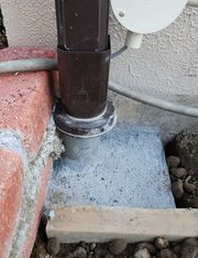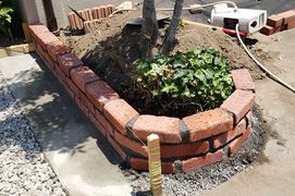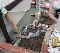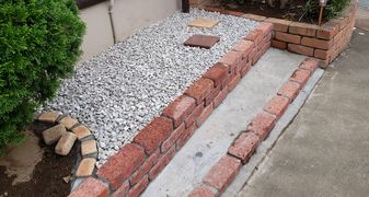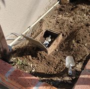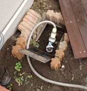 建物横の法面をレンガ積みにします。DIYで。初めてのレンガ積みですが、丁寧に進めた結果、ソコソコの仕上がりになりました。とりあえずレンガ積みと上面の砂利引きは終え、面積的には90%終わりました。しかし残りの10% ーーー散水栓の改造ーーーが大変だったんだ。馴染みのない規格を理解し、配管を考えてパーツを揃えるだけで一苦労でした。いよいよ水栓周りの工事にかかります。まずは散水栓を露出させます。フレキ配管をつなぐので、散水栓ボックスに切り欠きがある、あるいは樹脂製で容易に加工ができればよかったのですが、カッチカチの鋳鉄製でした。残念ですがこいつは使えねえ。埋めておいてもしょうがないので取り出すことにしました。しかも工事業者がちゃんとしていて?、きっちりモルタルで固めてくれていました。取り出すのに一苦労。なんとか取り出して、ハンマーで霹靂一閃!砕いたコンクリはまた埋め戻しました。散水栓を露出させます立水栓を立ててシンクを作っていきたいのですが、高さがなかなか決められない。埋まっていたので基準が取りづらい。木片や水糸や水準器を駆使してなんとか高さを決めました。こういう作業が時間かかるんだよね。プロじゃないから。本当はこういうセットが欲しかった。高かったんで諦めたんですけど。nikko 立水栓ユニット サークルタイプ 一口水栓柱+丸型パンセット 蛇口別一旦水栓を作っておいて、カバーをするのなら安く済みそうです。【枕木調 のみ予約販売11/9以降発送】FRP 水栓ユニットセット 枕木調 or ブリック(レンガ)調 / 立水栓 水栓柱 立水栓セット (57078-57108-57085-57115)まあ、将来的に考えることにしましょう。とりあえず今はまずは水栓柱を建てなければ。レンガや木材で仮止めします。水準器2連装着し、常に傾きに注意しながら仮組みして、散水栓の両脇にレンガを並べてモルタルで固めて立水栓を固定しつつ、シンクのヘリを作っていきます。歯抜けになっているのは、フレキチューブを通すため抜いておいた部分です。適宜モルタルで固定しながら、縁を作りました。きれいに並べたように思ったのですが、高さの基準がよくわからなかったので、実は傾いていました。あとから見て気づいたときには手遅れでした。やっぱりちゃんと基準を作って測定することが非常に重要です。明日に続く。