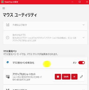 マウスクリックすると、黄色いボヤが出るようになりました。どうやらショートカットキーを間違えて打ったらしい。これが何の何という名前の機能なのか分からず、消すのに苦労しました。苦肉の策で、「クリックしたら黄色い丸が出る」とgoogle検索したら、PowerToysのマウス蛍光ペン機能であるということがわかりました。毎度のことながら、googleのエスパー度が高くて痺れる。消し方PowerToys → マウスユーティリティ → マウス蛍光ペンの有効化 をオフにする。ちなみに発動のショートカットキーはshift+windows+Hなので、間違えて打たないように。この機能、一体なにに使うんだろう?マウスポインタに常時付いて回るなら、目の悪い人のサポートに有効かなと思いますけど、クリックしたときだけ付いて、数秒でフェードアウトしてしまいます。どうやらこれは、操作説明ビデオとかで、クリックしたことを明示的に示すのに便利らしいです。なら、可愛らしく「クリック!」って文字が出たほうが面白いかも。不要な機能だとは思わないですけど(それ用のフリーソフトもあるぐらいですし)、shift+田+Hを打ったときに「マウス蛍光ペンを有効化します by PowerToys」と一瞬表示されても良いような気はする。【送料無料】蛍光ペン ラインマーカー 18色セット 水性 パステルカラー ツイン 速乾 カラーペン 暗記用 教科書/カレンダー/手帳にマーキング アンダーライン 色塗り イラスト 子供 学生 学校 オフィス 家庭ではごきげんよう。