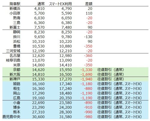 スマートEXは、在来線区間を含めて600km以上になる住民(圏央道以遠の北関東住民など)から往復乗車券割引を失わせるための強欲集金システム(笑)じゃないかってのが昨日の話ですが、600kmを超えないならスマートEXでもそこまでの差額は出ないです。ややこしいことに、のぞみを使った場合は高くなる(降車駅によって違う)し、群馬でも県央の高崎・前橋からと、一番東京に近い新町からでは損益が違う。EXサービス運賃ナビで確認出来ます。https://unchin-navi.jp/今後のこともあるので、東海道新幹線の駅について全部計算してやった。東京までは在来線、東京から新幹線に乗り、のぞみを優先利用した場合の片道の値段です。往復割引がある場合はその片道分を載せています。高崎・前橋発で、東海道新幹線・山陽新幹線の駅まで差額をグラフにしてみた。プラスになっているほうが、スマートEXを使ったときに得になるということです。Suicaのペンギン 缶メモ(ウィンク)【Suicaのペンギン Suica スイカ ペンギン JR東日本 缶 メモ用紙】在来線の往復割引が効く(在来線で601km以上になる)京都以遠は、明らかにスマートEXを使ったほうが高くなります。しかしそれまでの区間ならほぼ同じ、駅によってはスマートEXの方が安いこともあります。数十円高いぐらいなら、紙の切符の発券手間が省け、自在に予約を変更できるスマートEXのほうが良いでしょう。ひかり停車駅だと差額は小さいですが、のぞみを使う名古屋なら差額は大きくなります。姫路以遠はスマートEXも往復割引が入るので少し差額が縮まりますが、それでも往復で2,000円の差が出るとなると、お得感は皆無です。群馬からだと京都・新大阪・新神戸が最もスマートEXが割高になるところですね。東京から100kmぐらいの北関東3県はみな同じようなものでしょう。東海道新幹線で最も利用するであろう京都・新大阪・新神戸がピンポイントに高くなっているというのは、北関東いじめ以外の何者でもない。(言いがかりだと言うのであれば、在来線乗り継ぎも含めて600kmで往復割引にしてみろってんだ)Suicaのペンギン ふきん【Suicaのペンギン Suica スイカ ペンギン JR東日本 ふきん 台ふきん キッチン用品 吸水 速乾 中川政七商店 コラボ プレゼント かわいい JR 縦30cm×横40cm 綿100%】一言でまとめると、群馬県央からだと米原までならスマートEXが有利、それ以遠は紙の切符がお得ってことですね。専用のICカードを発行してもらって利用する会員制の「エクスプレス予約」なら特急券だけ買えるので、紙の乗車券を往復割引で購入でき、さらにスマートEXのような直前の予約変更も可能です。また会員割引として片道490円(往復960円)特急券が割引されます。年会費1,100円かかるけど、1回でも乗れば(乗車券の往復割引も合わせて)ほぼ元は取れます。使えるクレジットカートがかなり少ない(JR東海のJCB?)し、ICカードの郵送を待たないといけないので、申込みから3週間ぐらい必要です。年2回は確実に乗る、かつ、カードが増えても気にならない、という人はこれがベストですね。まあ、昔ながらのアナログ人間には、普通に紙の切符があったほうが安心ですどね・・・Suicaのペンギン手帳[本/雑誌] (2024年版) / オレンジページではごきげんよう。