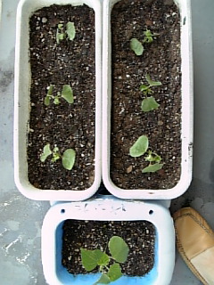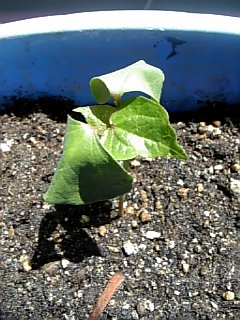 ごはんがうまい!いやいや。お菓子もうまい!!いやいや。ビールがうまい!!!…これじゃあ、肥えるばかり。いえいえ、そーでなくて。綿も元気だっ!!残念ながら…東京都23区支部のりりさんのところは、マンション改修工事のため、断念。綿園芸部は引退のおしらせ。しかたがないのだ。演芸に励んでもらいましょう♪しかし、各地からうれしいお知らせが!北海道支部のnikorinnさんからは…「たねを蒔いたよ♪」という便り。^^大事にしてもらってるね、大きくなれよ~♪北関東支部?のオトモダチ、フリージアさんからは「双葉がいっぱい出ているよ~」というお便りが。^^おお!元気そうだ!!うれしいです。遠い土地で元気に育ってるねえ☆彡東京都多摩支部の?yamagonnさん。ウチと同じ、ベランダ園芸でがんばっています。本葉も大きくなっただろうねえ~。^^静岡県支部のあの、他界センセイのところでもこの日の日記に、「双葉がでたよ」とかいてありました^^。(下の方にね♪)他の鉢のもでたかなあ!?理科室においてあるんだそうです。こどもたちにも見守られてるなんて、幸せな綿だ。。。reikaさんのとこでも種を蒔くよ♪って書いてあったし^^。あ、忘れちゃいけない。わたくしの師匠、MILOUさんみなさんにお配りした種の、もともとはこちらです♪ここは畑に蒔いてるのです。ワイルドな綿を、去年は宮崎まで見にいったのよねえ~。うう!今年も行きたい!!青い空!白い雲!でっかい太平洋!!で。わたしんちの綿は、現在この通り♪双葉は引退し、本葉に栄養がいきわたり始めました。みどりが、きれいでしょ!?↑既に親ばかなり~。(^-^;後発組も、ちらほらと本葉が…。今日も元気ですっ(^ー^)ノああ、久々に純粋な園芸ブログになったわん(*^-^)!!皆様からの途中経過引き続き、おまちしてます~^^。