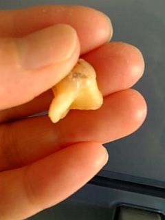 こんなん取れました。あんまり根っこがでかいので先生が「こんな根っこはみたことない。ぜひ持って帰ってお家の方に見せてあげてください!」と。おうちのかたは「デカ!!でかすぎるだろうおまえ~!!」その日は麻酔のきいた頭でよろよろ帰ってしばらく倒れてました。翌日、消毒に行ったら「どうです?見せてあげましたか?( ̄∇+ ̄)vキラーン」「見せてあげました^^」といったら「どうです?びっくりしたでしょう、ね?ね?」とカワイイ先生です。( ̄ー ̄)でかすぎる親知らずを抜いた後はでっかい穴が開いてます。なんだか憑き物が落ちたようです~~♪
