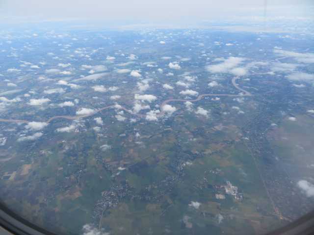 シェムリアップ空港を離陸したFD611便。少しもやがかかっています。道路に沿って町が見えます。その後見えてきたのがこの風景。トンレサップ湖です。調べてみるとこのトンレサップ湖は、インド亜大陸とアジア大陸の衝突のあと沈下によってできた堰止湖なんだそうです。雨季と乾季でその規模は大きく変化しますが、東南アジアで最大の湖です。この湖を使ってシェムリアップと首都プノンペンを結ぶ船もあるんだそうです。そんなカンボジアを離れると雲が多くなってきました。そして国境を越えてタイへと入りました。眼下に見えるのはタイです。飛行時間はおよそ1時間です。着陸態勢に入りました。眼下には新興住宅地が見えます。どこかわかりませんが貯水池が見えます。