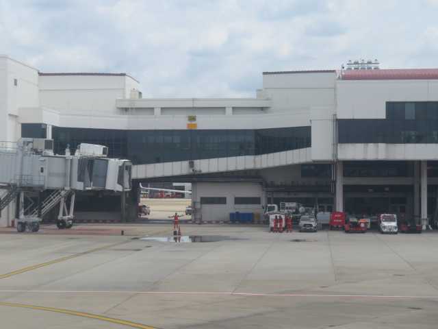 シンガポール航空機がゲートを離れました。滑走路へ向かっていきます。滑走路に入り離陸の許可を待っています。そしてシンガポールに向けて離陸していきました。下では整備スタッフが動き始めました。間もなくエアアジア機がドンムアン空港から到着するのでしょう。出発ゲート前でもスタッフが動き始めました。ドンムアンからのタイエアアジア機が着陸しました。滑走路から誘導路に入ります。そして18番ゲートに到着しました。あとは搭乗開始のアナウンスを待ちます。FD611タイエアアジアのバンコクドンムアン行。搭乗口のドアが開きました。いよいよ搭乗です。こちらは規制テープがあり行けません。搭乗機までが結構歩きます。あそこまで歩いていかなければなりません。搭乗機のドアの手前で一枚。そして機内に入りました。着席してあとは出発を待ちます。