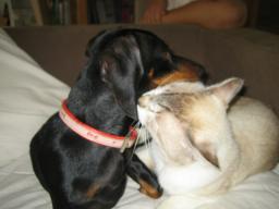 テレビを見て、わんこにでれでれの人をバカみたいだと思っていました。 (ハイッすみません(- -;) しかし、自分が飼ってみるとカワイイ、癒される、我が心の友よ・・・ チョー仲のイイ 二匹です。 完全に猫が犬より立場がウエです。 近頃、テレビを見ているとウチのが一番カワイイだぁ~♪