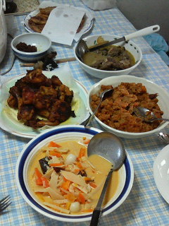 これはインドネシア人の友人が作ってくれた今日のランチです。断食のラマダン明けということで、今日は10:30~17:00の間、途中一緒に幼稚園へ子どもたちをお迎えに行き、ず~っと食べてしゃべって楽しく過ごしました♪手前 「サユール」真ん中左「クレイ」 右「サンバルゴレーン」一番奥 「アヤンゴレーン」インドネシア語なので、発音を上手く日本語で表記できないけれど、そんな感じのお料理でした。この他にも、おやつの揚げ物と、ヨーグルトサラダとご飯、それからたくさんのお菓子も用意してくださいました。どれもとってもおいしかったです☆インドネシアの家庭では、家族がたくさんいるのでお料理の量が多いそうです。それを何品か作っておいて、朝から晩まで、品がなくなるまでおなじものを食べるんだって。無くなった品があれば、また違うお料理を大量に作る。冷蔵庫には入れないで常温保存のため、サラダなどを抜かして、ほとんど火を通した料理で、香辛料もたくさん入れるそうです。食文化って面白いねぇ!嬉しい一日を過ごせました。