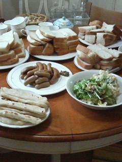 私の周りには、ホームべーカリーを持っている人が3人もいたの。そして、どのメーカーの物を買おうかと悩む人が2人。そこで、ホームベーカリーで作ったパンの食べ比べランチ開催!大人7名・子ども5名が集まり、今日はにぎやかなランチタイムでした~♪私も含め、それぞれが違うメーカーのベーカリーを持っていたので、4社のパンを食べ比べでした。私も買う前にやりたかったわ~。今朝からパンを焼き、圧力鍋で野菜スープを作り、アップルチーズパイを焼き、子どものお弁当を作り、それはもうめまぐるしい朝でした。サラダの差し入れや、パウンドケーキも加わり、とぉっても贅沢なランチ!そして各メーカーの焼きあがったパンの違いは、ほとんどない!ただね、取り説にある基本のパン材料が違ったり、具を入れる要領が違ったり、ガタガタうるさかったり、お知らせメロディーがうるさかったり、そういった違いがありました。私は、天然酵母ではるゆたかブレンドの小麦粉を使っていたため、やっぱりパンの食感や味が違いました。モチモチしていて、味わい深いの。でも、市販の食パンを目指すには、適さない材料かなぁ。ふくらみやふんわり感が違うのよね。ま、そのあたりはお好みですね☆アップル・チーズパイも好評で、ホッと一安心。今日もHappy!感謝です☆