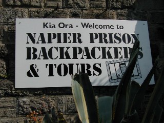 ネイピア刑務所は、ニュージーランドで一番古い刑務所です。今は、保存を兼ねて、バックパッカー’s、つまり、ユースホステルになっています。今回のネイピア旅行の、最大の目的、それは、刑務所に泊まることだったのでした!!ワーオ!!どんなかしら。ユースホステルって、おばさんでも泊まっていいの?はい、いいですよ。お部屋は、どんな?1.独房2.相部屋:6人くらい・・・15ドル(1000円くらい)3.Wベッドの個室・・・50ドル(一人25ドル)で、Wのお部屋を予約。頼むと、夜、見回りもしてくれるそうな。看板に、ちゃんと、ツァーと、出ています。9:30、3:00の2回見学ツアーあり。必見。まず、身長板の前でパチリ!何にもない、四角いコンクリートの箱で、ドアがすごい。カシーンと、音をたてて閉まり、二重鍵をかけられたら、思わず、「出してーーー!」と、叫びたくなる。中から、見たドア。せっかくだから、外から鍵をかけてもらいました。こ、こわかったあ!!運動場。その名も、”ケージ”と呼ばれ、完全にアミの中です。空も、鉄の網の中から見るのです。廊下、ここを、監視人が歩いているわけ。ハングのためのロープ。ハングは、有料で見ることが出来たんだって。後ろの塀の上が、ひとまわり歩けるくらいの小道になっています。敷地内には、初めて吊るされた人、2番目に吊るされた人のお墓というか、単に、この下に埋めてある印、というか、があります。泊まった部屋は、元は、相部屋だったらしい。部屋の中に、便器がありました。シャワーは、共同です。今は、一応、囲ってありますが、昔は、全て、ドア越しに監視できるようになっていたんですよね。いい経験、しちゃいました。敷地内に入っただけで、胸がぎゅーんとなる感じ。ベッドなど、もちろん、とても清潔なのですが、あくまでも、雰囲気にも保存を目的にしたところが見られ、(非常に古いシーツなど)昼間でも怖いのでした。翌朝、ようやく出所。思わず、「おつとめ、ご苦労さんでした。」と、言ってしまいました。