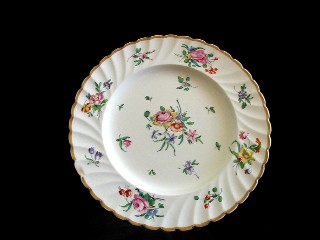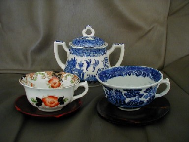 ブルーウィローを集めるようになると、いろいろ疑問が沸いて来る。その一つは、陶磁器にプリントする技術のことである。例の青い染付けのことを、中国では、青花、ヨーロッパでは、単にブルー&ホワイトと呼ぶらしい。この、青を出すために、英国陶磁器の歴史は発展したといっていいらしい。何故、それほど、この色が人気があったのか。実は、私は、ブルーウィローに出会うまで、青一色の染付けに興味がなかった。マイセンのブルーオニオンの名前も、R・コペンハーゲンのブルー・フローラルの名前も知らなかった。ゆっくり見たこともなかったし、欲しいとも思わなかった。今、少しずつ見る機会が増えてそれらの色を見ると、何と、凄い仕事なのだろうと驚いてしまう。食文化という、人間の根源的な部分に芸術性を見出せたのは、これら、高級食器メーカーのおかげではないか。さて、ブルーウィローに戻ると、これは、プリントの食器なのだ。青い食器に対する憧れが強いと見た、商才あふれるウェッジウッドの一家と、その2代目、ジョサイア・スポードが、青い食器を安く大量生産できれば、莫大な儲けにつながると考えた。ウェッジウッドの歴史は、高級食器の歴史ではない。産業革命を始めに経験したイギリスらしく、機械化と大量生産によって、家内工業的だった陶磁器産業を、イギリスを代表する企業に発展させようとした一家の歴史なのだ。従って、青い染付けを機械化するという発想は、当を得ていたことになる。とにかく、そのための努力を惜しまず、スポードは、銅版印刷を素焼きの白磁の上に施す方法を完成させた。私も、勉強中なので、間違っていたら訂正してください。まず、銅版にエッチングの技法で絵を描きます。ごく、薄く溝が彫られます。そこに、薬品を流し込み、腐食させます。さらに、釉薬を流し込み、絵を紙に転写。紙を、白い素焼きの陶磁器に貼り付けます。焼成→紙が焼け落ちて、色が残る。ざっと、こんな具合かしら。美濃焼きの焼成についてのHPを参考にしました。銅版にエッチングしてあるということは、原版の保存がきくわけだから、大量に同じ版が作れるようになったというわけ。従って、今でも、18世紀の原版で同じものを作る事ができる。しかも、銅版に細いキリのような道具で描くわけだから、細かい描写も可能になった。ブルーウィローや、ブルーイタリアンの精密な絵を思い浮かべてね。さらに、改良を加えたい。単に、印刷しただけでは、青花や、日本の染付けの味が出ない。何が、違うんだろうか。多分、”にじみ具合”だと思われる。そこで、にじませる技法に取り組んだ。大倉陶園や、深川製磁の、青くにじんだ絵付けを思い出してください。これが、また、むずかしい技術だったと思われます。しかし、ついに、それも克服し、ロマンチックな絵を選び、イギリスの陶磁器産業は発展を続けることになったのでした。さて、較べてみると、こうなります。写真で、わかるかしら。ロイヤル・ドルトン、1900年。にじんでる?チャーチル、モダン。にじんでないよ。