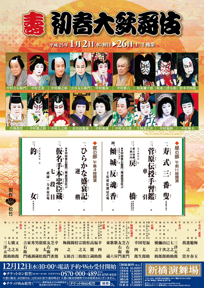 新橋演舞場 夜の部逆櫓元のお話は、義経と梶原なんとかが反目した発端のエピソード。このエピソードは、それだけで一本のドラマですね。船に櫓がある。漕げば前に進む。しかし、逆さに櫓をつけておけば、退却が迅速にでき、味方の損害が少なくなる。こう進言した梶原に、「逆さに櫓をつけて、初めから退却する気でいるなんて、何という臆病者だ」っと侮辱する義経。梶原は、この辱めを一生忘れない。その逆櫓が、バックに潜むお話。それを思い出しながら見ないと、面白くない。思い出さなくても、人情ものとしてもいいんだけど、思い到ると、にわかに舞台の上は男同士の争いになる。子供の取り違えが招く悲劇なのだが、それだけじゃない。一、 ひらかな盛衰記(ひらかなせいすいき) 逆櫓 船頭松右衛門実は樋口次郎兼光 幸四郎 お筆 福 助 女房およし 高麗蔵 船頭明神丸富蔵 松 江 船頭灘若九郎作 廣太郎 畠山の臣 宗之助 畠山の臣 桂 三 漁師権四郎 錦 吾 船頭日吉丸又六 錦之助 畠山庄司重忠 梅 玉 四世中村雀右衛門一周忌追善狂言二、 仮名手本忠臣蔵(かなでほんちゅうしんぐら) 七段目 祇園一力茶屋の場 大星由良之助 幸四郎 お軽 芝 雀 赤垣源蔵 友右衛門 富森助右衛門 廣太郎 大星力弥 廣 松 鷺坂伴内 男女蔵 矢間重太郎 秀 調 斧九太夫 家 橘 寺岡平右衛門 吉右衛門三、 釣女(つりおんな) 太郎冠者 又五郎 大名某 橋之助 上ろう 七之助 醜女 三津五郎一、ひらかな盛衰記(ひらかなせいすいき) 逆櫓 船頭に姿を変えた英雄の覚悟とは 婿を亡くした漁師権四郎の娘およしに入り婿した船頭の松右衛門は、権四郎の家に代々伝わる逆櫓という技を習得し、源義経が乗る船の船頭に任じられます。ここへ現れたお筆の話から、権四郎とおよしが巡礼の途中で実の子槌松と取り違え、替りに連れ帰った子が木曽義仲の遺児駒若丸であるとわかると、松右衛門は態度を一変させます。実は松右衛門は、義経に討たれた義仲の遺臣樋口次郎兼光で、亡君の仇を討つ覚悟だったのです。その計略もむなしく、樋口は大勢の船頭に取り囲まれます。権四郎の計らいで駒若丸は畠山重忠に助けられ、その心に打たれた樋口は、縄にかかるのでした。 壮大で重厚な時代物をご堪能ください。 二、仮名手本忠臣蔵(かなでほんちゅうしんぐら) 七段目 遊興に隠す由良之助の大望と兄妹の決意 主君塩冶判官の仇討ちの大願を隠すため、祇園で遊興に耽っている大星由良之助のもとに、顔世御前からの密書が届きます。その書状を遊女のお軽に盗み読まれたことに気付いた由良之助は、お軽を身請けすると言って去ります。お軽の兄の平右衛門は、由良之助の真意を悟り、自らが妹を手にかけて、それを手柄に仇討ちに加わろうとし、お軽も兄に従おうとします。これを由良之助が止め、平右衛門が仇討ちの徒党に加わることを許すのでした。 『仮名手本忠臣蔵』の中でも華やかで人気の高い場面を、お軽を当り役とした四世中村雀右衛門の一周忌追善狂言として上演いたします。 三、釣女(つりおんな) 結婚相手を釣り上げるユーモア溢れる舞踊劇 大名と太郎冠者は、妻を得ようと恵比寿神社に参詣します。その神前で眠りについた二人。霊夢によって釣針を与えられた大名は、美しい上ろうを釣り上げ、その場で祝言をあげます。それを見て焦った太郎冠者は、被衣をかぶった女を釣り上げ、夫婦になろうと誓い合います。しかし、被衣をとると二目と見られない醜女。太郎冠者は逃げ出そうとしますが...。演舞場