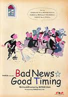 バッド・ニュース☆グッド・タイミング☆☆☆☆you tube三谷幸喜の舞台。コメディというより、長編コントって感じかなあ。何と言っても、芸達者なお父さん二人が、劇中で漫才をやる。それが面白い。前半、丁寧なシチュエーション説明が、長過ぎて、このまま終わっちゃうんじゃないかと心配したが、お父さんたちが出てきてからはテンポも上がり、大爆笑だった。役者の力の凄さ。半端じゃない。まずは、どれだけ二人が頑固か、頑固オヤジが、こんなに愛しい存在か、そこがおかしい。内容はあってないような話。それでこれだけ笑える。って、王道だよね。でも、二度は見ないだろう。その潔さもいいんじゃない?(2001年、パルコ劇場) 伊東四朗、角野卓造、沢口靖子、生瀬勝久、久野綾希子、八嶋智人、伊藤正之ストーリー。つきあってるのも内緒なら、もちろん結婚式も内緒・・・なぜなら、お互いの父親がとある事情で犬猿の仲。そう、2人はまるでロミオとジュリエット、味方は花嫁の母(久野)ただ1人。「でも・・・やっぱりお父さんに祝ってほしいの」という訳で、お互いの父親を勝手に呼んじゃった花嫁(沢口)。そして新郎(生瀬)がその事実を知ったのは、なんと披露宴2時間前!2人の(というより主に新郎の)心配と裏工作をよそに、結局顔を合わせてしまう双方の父親(伊東・角野)。この2人、かつて人気急上昇中に喧嘩別れした漫才コンビ。片や売れない芸人片や市会議員の先生とくれば、久々の再会に喧嘩の始まらない訳が無い。ところがあにはからんや、説得工作で周囲が右往左往するうちにこの2人、全てのてんやわんやは自分たちのコンビ復活を皆が望んでいるためだと勘違い。衣装合わせにネタ合わせ、いそいそと練習始めるオヤヂコンビの姿に、ウエディングカップルだけでなく居合わせた喫茶室のウエイター(八嶋)までがやきもきする羽目に。そして、何も知らずに巻き込まれたウエディングコーディネーター(伊藤)の運命や如何に・・・。