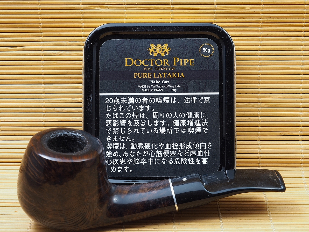 新たに輸入が始まった「ドクターパイプ」というブランドのパイプ煙草を今回から吸い始めます。その最初は一番強烈そうな「ピュアラタキア」です。 このブランドは、ブラジルの「Tabacco Way」社のパイプ煙草ブランドで、基本的にブラジル産の煙草葉を使っているようです。面白いのは、ラタキアもブラジル産を使用しているという点です。ラタキアと言えば、大本の原産地であるシリア産と、シリア産の供給不足によって近年の主流となっているキプロス産が有名だと思うのですが、ブラジルでもラタキア=「煙草葉(主にオリエント葉)の薫製」を作っていたとは知りませんでした。 で、その注目のブラジル産ラタキア100%のフレイクであるという本銘柄を、同ブランドの最初の銘柄として選んでみたという訳です。 では、開けてみましょう。 開封時の香りは、シリア産やキプロス産のラタキアとはかなり違った感じがします。あれらよりもっと軽く、草木っぽく、腐敗臭とか糞尿臭的な「臭~い」という感じがありません。ともすればフルーツ的なニュアンスさえ感じます。これだと吸いやすそうですし、悪臭対策も軽く出来そうです。カットは、幅35mm長さ80mm厚さ2.5mmぐらいのフレイクなのですが、殆ど崩れかけた形状で缶に詰められていて、完全な四角形で取り出す事は出来ませんし、枚数も数えられませんでした。湿気はフレイクとしては標準的な感じです。 この崩れかけたフレイクを適量取り出し、テキトーに丸めて火皿内径20mmのパイプに詰めます。そうして着火しますと、確かに薫製にされた煙草葉っぽい匂いではあるのですが、シリア産やキプロス産のラタキアとは明らかに異なり、臭みの少ない軽い香りが来ました。この香りは、食べ物の薫製に近く、ちょっと美味しそうな香りです。これなら出勤前に吸っても、周囲の反感は買い難いのではないでしょうか。ただし、ちょっと強火力で着火したり、燃やし過ぎたりすると、やっぱりラタキア特有の臭みが出て来てしまうので、その辺は注意が必要です。 味は硬質で太めのコクと旨味で吸わせるタイプで、甘味の類は殆ど感じません。かなり硬派な味と言えるでしょう。 火付きと火持ちは良くないです。分厚いフレイクを丸めただけでパイプに詰めているので、そうなるのは当然です。しかも、強火力で再着火しようとすると臭みが出るので、着火にも気を遣います。テクニック的には少し難しい部類になるかも知れません。燃え進みも遅いです。 喫煙中盤、喫味は基本的に変化していません。太めのコクと旨味で吸わせます。う~ん、ちょっと酸味もあるかなぁ。開封時に感じたフルーツ的な部分は、この微かな酸味に由来するのかも知れません。それと、この段階で少しの辛みも感じます。燃え進みはやはり非常に遅く、ここまでで1時間以上かかっています。 喫煙終盤も喫味は変わりません。燃え進みが遅く、喫味の変化もないので、いくら吸いやすい喫味と言っても少し飽きて来ました。逆に言えば、ちょっとの量での喫煙でも十分な満足感が得られそうです。 という事で、喫煙終了。後味は硬質で太めのコクと旨味、残り香は食べ物の薫製に近く、且つ軽い感じのラタキア臭でした。 全体的に見て、確かにラタキアの喫味ではあるのですが、シリア産やキプロス産とは大きく異なる味わいで、コクや旨味の太さの割りに臭みが少なく、ラタキア慣れしていない人でも吸いやすそうな煙草でした。 今まで吸って来たラタキア物の中では最も吸いやすい部類だと思います。何より臭みが少ないのが良いです。ただ、ラタキア100%の銘柄というのは以前にも吸った事がありますが、想像以上に吸いやすかった記憶があり、案外そういう物かも知れません。ですから、他の葉とブレンドした時にどうなるか、大変興味深い所です。[興味深い煙草ブログは此方 Click!]