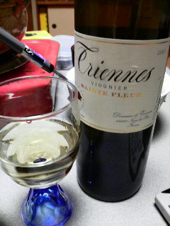 昨日の晩ご飯(私は、常にPM9:30)は鶏鍋(しょうゆベース)!!に合わせて晩酌したのがこのワイン。お名前を「ヴァン ド ペイ デュ ヴァール ヴォニエ サント フレール ’05/白」・・・長いお名前ですコレは、フランスのプロヴァンス地方の白ワイン。このワインの凄いところは、なんといっても造り手!!ブルゴーニュの名匠ドメーヌ デュジャックのオーナー「ジャック セイス」と!ワインの王様ロマネ コンティのオーナー「オーベール ド ヴィレーヌ」が!コラボしたワイナリーが「ドメーヌ ド トリエンヌ」でこの手のワインを造っているのです!!これまた凄いのはこのワイン、ヴィオニエ種というちょっと珍しいブドウを100%使用しているところ!!このブドウのおもしろいところは、テイストがちょっと日本酒に近いのです!!・・・でも、ブドウ特有の果実味もしっかりしているので、嫌味になりませんとってもイイ感じですよ。そして、仕上げは・・・稲庭うど~ん!!私、個人的に大好きうどんにしては細麺なので、チュルッチュルとスムーズにのどを通っていきます!!・・・そして、最後は・・・ウィ~・・・酔っ払いました。でも、気分はサイコー!!