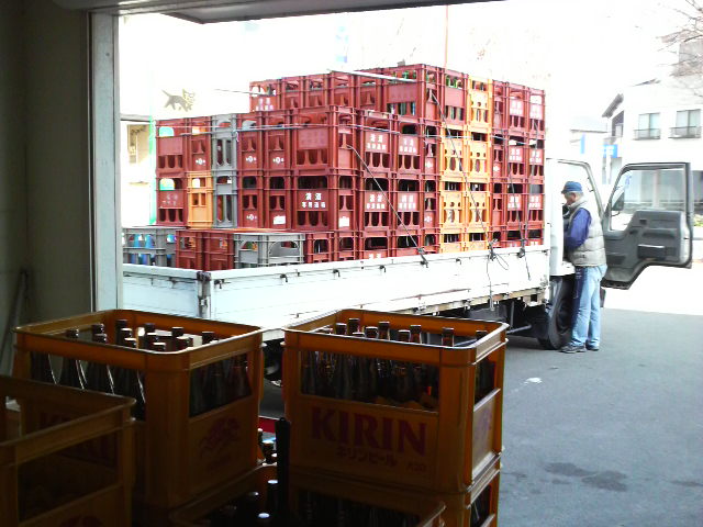 月に一度・・・一升瓶の空瓶を回収してくれる業者さんです。・・・ひどいときは、あと2段ぐらい積むそうです。近くで見ると・・・結構絶景です