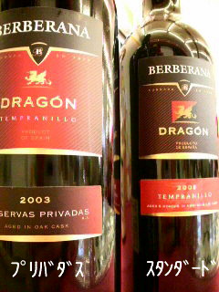 我が三平で人気のスペイン赤ワイン「テンプラニーリョ ドラゴン ビノ デ ラ ティエラ」のスペシャル キュヴェを今回入荷しました!!(左のワイン)ドラゴン テンプラニーリョ レセルバス プリバダス ’03スタンダードのドラゴンとは違い、ブドウの作柄の良い年のみに造る自信作!!熟成もスタンダードが6~8ヶ月に対してプリバダスは18ヶ月アメリカンオークの樽を採用し、香りの中にもちゃ~んとオーク樽のバニラ香が心地イイ感じでついています。しかも、熟成感のある柔らかいバランスの果実味がたまりません!!2008年、最初の赤ワインはコレで決まり!!