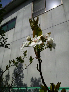 ・・・ついに咲きました!!問:コレは何の花でしょう??答え:梨の花です!!(早っ!!)5年前に梨好きが高じてお店の裏庭に植えました・・・でも、後は放ったらかし・・・(=_=;)専門的にいうと、かなり育てるのが難しい植物らしいです。・・・でも、花も咲いたし・・・まっ、いっか・・・今年は、自宅で梨狩りできるかも(^3^)v