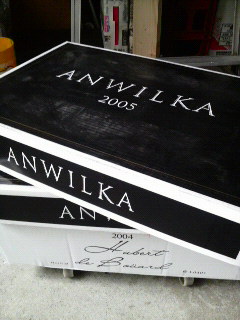 ・・・お店の倉庫にスーツの箱(発想が昔っぽい・・・)(=_=;)・・・間違えました。ついに入荷してきました!!アンウィルカ’05コレは南アフリカのステレンボッシュ産のワインのなのです。・・・しかし!!造っている方々はフランスの名シャトー 「シャトー アンジェリュス」のオーナーのユベール ド ボウアール!「シャトー コスデストゥルネル」の元オーナー、ブルーノ プラッツの夢のコラボレーションのワインなのです伝統あるシャトーのオーナー達が南アフリカでねぇ~・・・2005年が初リリースらしいです・・・・・・しかも非常に入手困難!!セパージュはカベルネ ソーヴィニヨン50%・シラー50%です!!・・・コアなワインです・・・(*^3^*)ノ飲みたいよぉ~