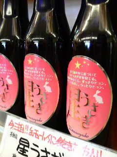 昔から人気なのが、梅の宿酒造さんの「星うさぎ」!!今流行の微発泡性の日本酒です。・・・が!!この「星うさぎ」は、ブルーベリーのテイストがブレンドされています!!ブルーベリーの甘さと酸味が心地よく、度数も6~7%!!若い女性を中心によく売れてるんですよ~ (・∀・)/食前や食後に!シャンパングラス(フルートグラス)に注ぐと・・・オ・シャ・レ!!お風呂上りにもイイかもで~す (¬v¬)v日本酒とは思えないおいしさにビックリですよん。(*^。^*)