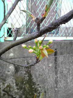この花は何の花でしょう??答え:梨の花です!!・・・私、チビの時から梨が大好きで、5年前に梨の苗木を裏庭に植えました2年前からようやく花がつきはじめ、その年はサクランボのような梨ができました・・・しかし、あれから音沙汰がなく私自身も梨の木の存在を忘れておりました・・・今年、ようやく180cm台に成長!!つぼみがつきましたぁ~今年はデッカイ梨の実ができるかも・・・