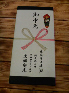 鹿児島酒造さんの黒瀬 安光 杜氏さんから御中元をいただきました!!(TーT)・・・カンドウ。ありがとうございました。m(_ _)m・・・キョウシュクデス。