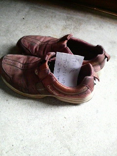 今朝、私の靴に張り紙が・・・・・あんにゃろ~!!どこじゃ~!!!ウリャァァァ(ノ#`Д´)ノ・・・デテコンカイ!