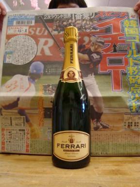 野球日本代表(サムライジャペ~ン)が、ライバル韓国代表にコールド勝ち!! いよっ!!♪(。ゝω・。) という事で昨晩、完勝を祝して泡物を。 フェッラーリ マキシマム ブリュット NV/白 イチロー君にはフェッラーリがよく似合う。なんつって。 でも、このフェッラーリもすごいんです!イタリア大使館の公式晩餐会には必ず出され、ミラノコレクションのパーティーでも必ず飲まれているほど素晴らしい品質! もちろん、ワイン関連の品評会でも毎年数々の賞を受賞しています! まさに、最強のスプマンテ(スパークリングワイン)なのです!( ̄∀ ̄)v ・・・ちなみに、写真で見切れているのは専務さんです・・・。( ̄∀ ̄;)