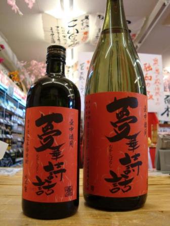 ついに入荷してまいりました芋焼酎「夢華詩話」! 三平が山口県初の特約店です(多分)!( ̄∀ ̄)v 蔵元は、「にごり焼酎」の山元酒造さん! が!!この「夢華詩話」、通常の造りとは全く異なる、別の場所で造られてます!Σ(-∀-;) 山元酒造さんは大きい蔵元さんですが、別に「手造り蔵」も持っていらっしゃいます。 そこには、むかしながらの木桶蒸留器があり、ゆっくりと丁寧に造られているのです! しかも!!( ̄□ ̄)! 情熱的な志を持つ酒専門店主達が蔵元さんと組み、芋や米の植え付け段階から企画さ れたこだわりの逸品なのです! 原料は甘味成分の多い赤芋。麹は黒を使用。蒸留は木桶蒸留。 原料臭が抑えられたほのか~に香る甘い香り。 口に含むと、最初に程良い甘さを感じます(甘ったるくはありません)。ミデイアムな旨味と、後味にくるほのかな香ばしさが非常にセクシー(?)!( ̄∀ ̄) 関東エリアのとある特約店さんでは、人気No.1だそうです! 飲み飽きしない逸品をいかがですか?( ̄∀ ̄)