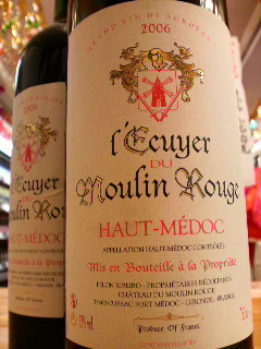 商品名:レキュイエ デュ ムーラン ルージュ ’06/赤生産国:フランス ボルドー地方 オーメドック地区 ブルジョワ級生産者:ファミーユ ペロン エ リベロブドウ品種:メルロー60%・カベルネ ソーヴィニヨン30% カベルネ フラン10%味わい:豊かな果実味と柔らかな喉越しのフルボディ価格:750ml ¥1,680 イイですよ~コレ。黒系果実とちょっぴりスパイシーな風味が絡み合う香り、ちょっと樽香もあるかなっていう感じです。しっかりしたコクを感じるのに柔らかな余韻がなんとも ファンタースティック!! 実はコレ「シャトー ムーラン ルージュ」ていうワインのセカンドです。 セカンドっていうのは各シャトーの持っているトップ銘柄に次ぐモノで、主に若木(樹齢15年ぐらい)のブドウを使っています。しかし、醸造はトップ銘柄と同じなのである意味お買い得! しかも!このワイン、あの!毒舌ワイン評論家ロバート パーカーJr.が大のお気に入りワインとして紹介しているのです! コレ、一飲の価値アリアリの逸品ですよ! ぜひ!(`・ω´・)v