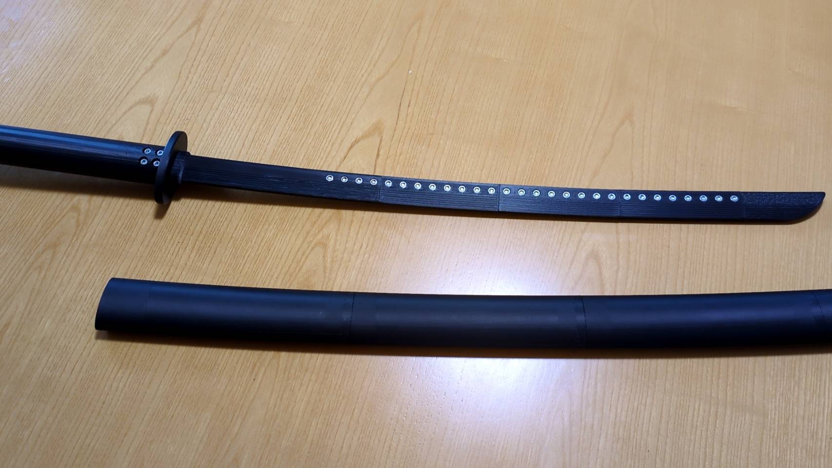 3Dプリンタで刀を作りました。なんで、作ったのか。この間、客演した舞台の殺陣の練習用に。とりあえず、殺陣の基本型を覚える為に刀が欲しいなーとなりまして。ネットで色々探したんだけど当たり前だけど、刀だから長い。そんな長いものを家で振り回せるわけない。外は寒いし室内で練習したいしさ。どうしよーかなーと考えてあー、そーっかー、自分で作ればいいんだ。となりました。それで、作ったんだけどまーどーせなら、「さや」までちゃんと作りたいなーと。そんなこんなで出来たのがこちら。けっこう、見てくれはカッコイイと思うんですよ。素人の想像の中の刀だから、まー色々違うのは違うんだけど。ポイントは、3Dプリンタのサイズの関係で分割する必要があったのでボルトとナットで留めたんですがせっかくなら、刀紋みたいに見えないかなーとボルトを並べてみました。自画自賛なんだけど、イイ感じじゃない?でもなー、致命的な欠陥があって所詮、プラスチック。絶望的に強度が無い。素振り用は、刀を短く連結するので、強度は気にならないけど実際の刀サイズだと強度は絶望的に貧弱。鑑賞用でしかない。まあ、でも、さやもあるし、抜刀と納刀の練習は出来るよ。今回、殺陣をやって気が付いた。抜刀となにより納刀が一番難しい。付け焼刃だと、この二つは経験が出るから、ごまかせない。まあ、とはいえ、強度よ。私的には、お粗末な出来だなーと思うけど「観賞用」でもいいと嫁入り先が決まりました。3Dプリンタってホント色々出来るようになったしここ数年で、びっくりするぐらいに技術がすすみましたねぇ。おかげ様。日々の生活に感謝を。