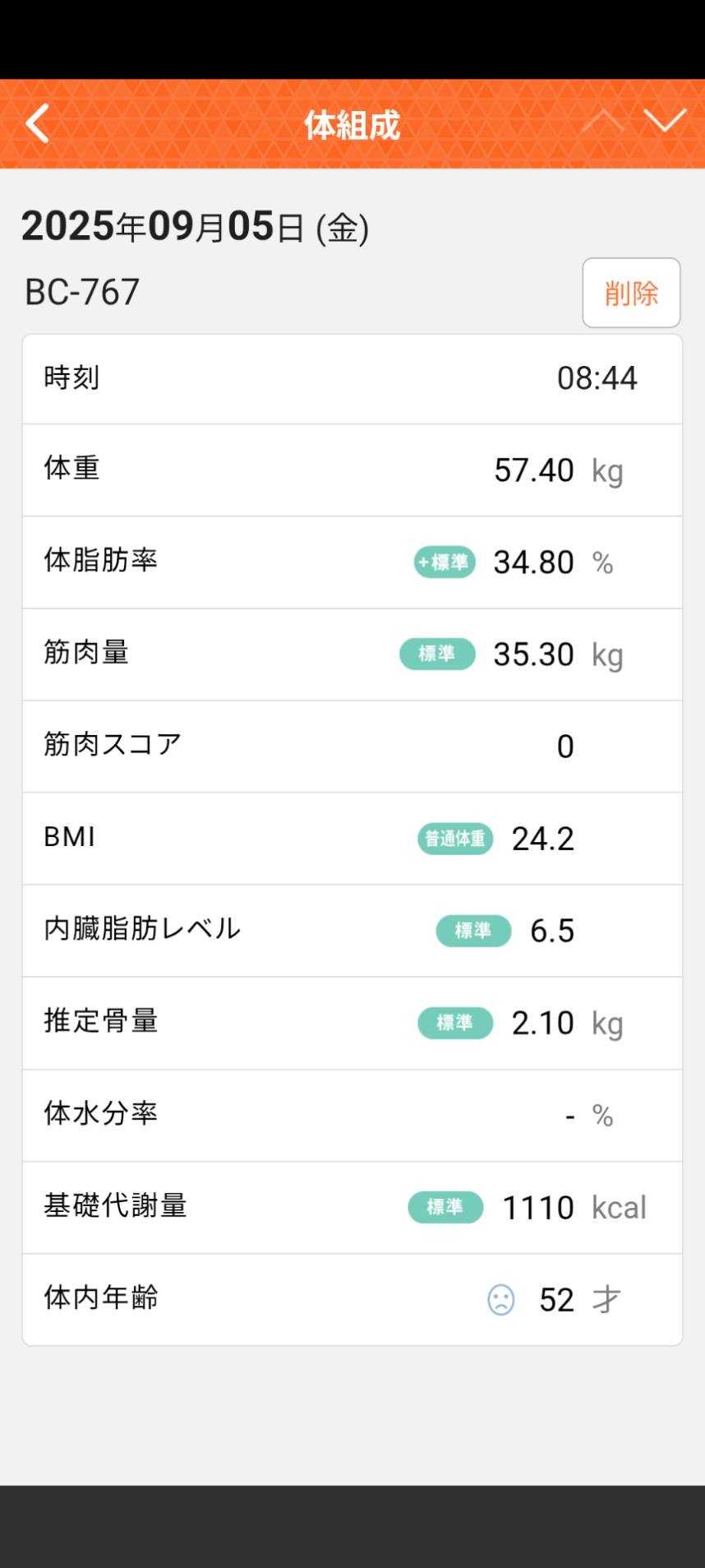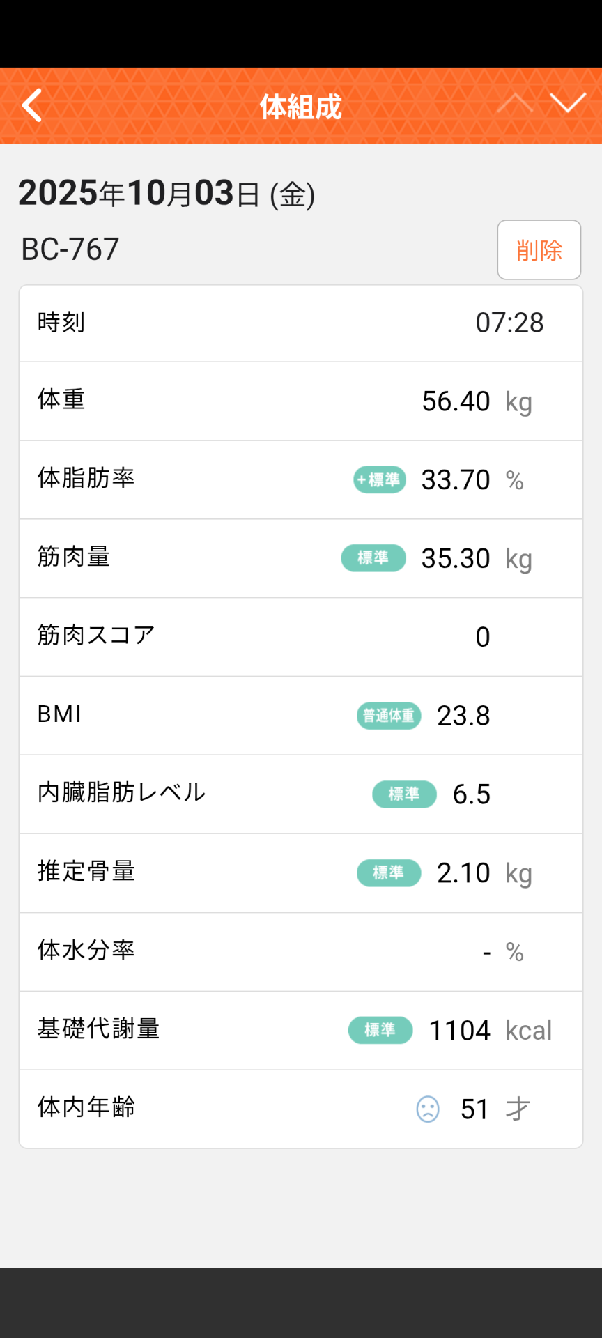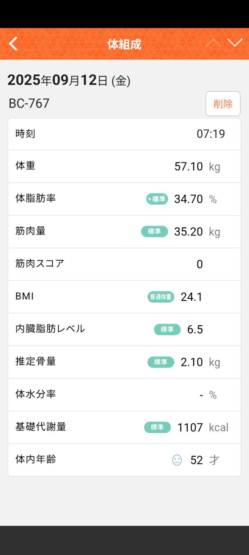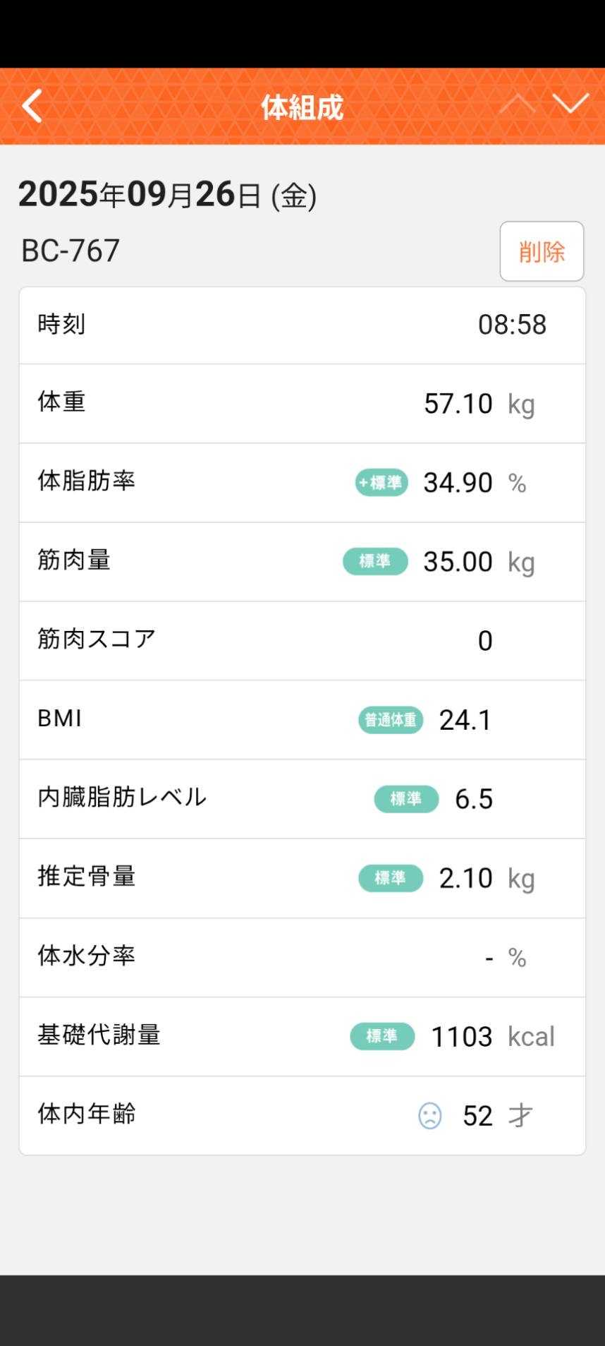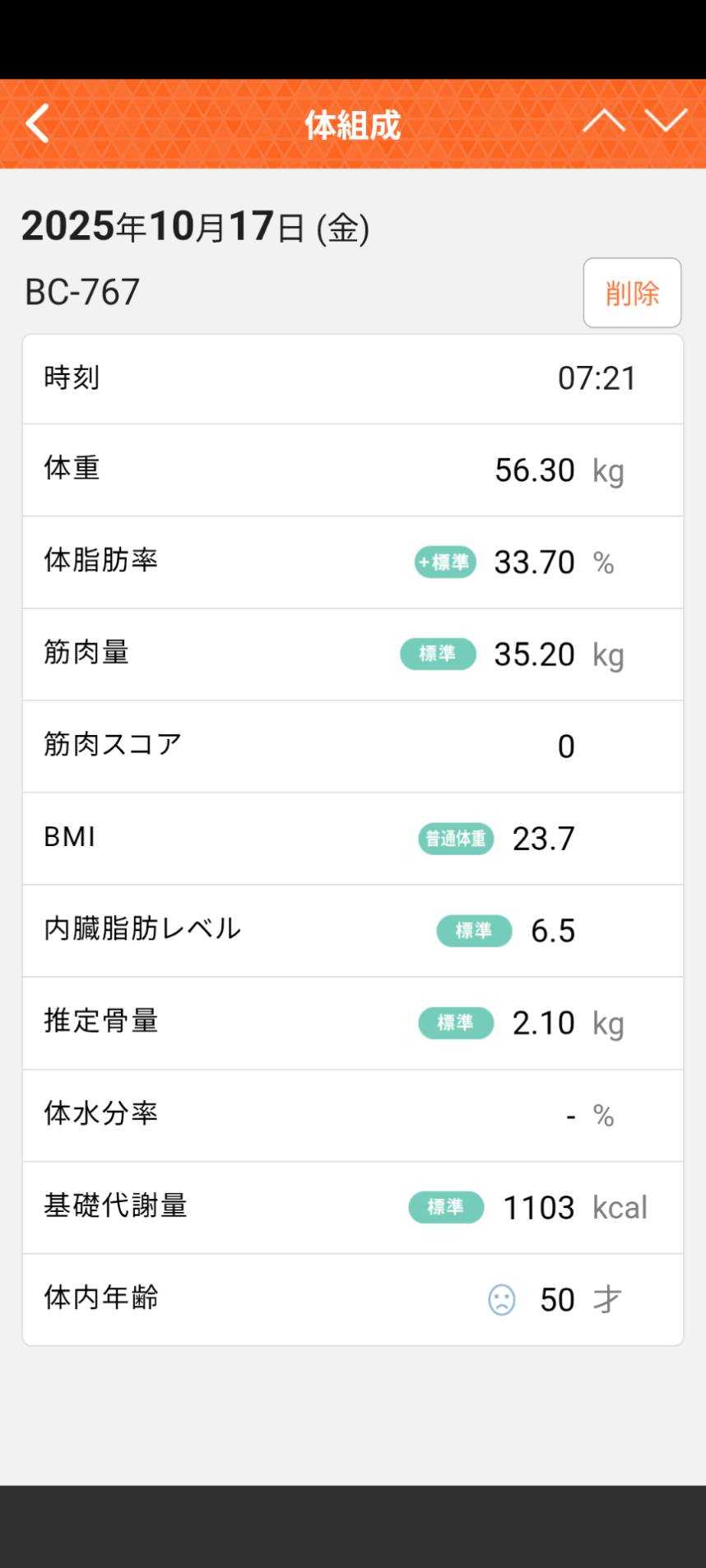 なんだかんだで、5週目になりました。タニタ BC-767-WH 体組成計 パールホワイトとうとう体重変化がありました。体重56.4Kg体脂肪率33.7%減ってます!減ってますよーなんかしばらく変化がなかったのでめちゃくちゃ嬉しい。ちゃんと身体は変化してきてるってね。体重の変化があったことはもちろん嬉しいけど体脂肪率が下がっているのが個人的にはより嬉しい。コレって、脂肪が落ちたって事だから。あー、努力が形になってるかもと実感があるというのか。というわけで、来週も頑張ろー。(おー)来週の目標は体重56.1Kg体脂肪率33.5%コレって順調にいけば、10月の末に55Kgいけるか!?いかんいかん。無駄な希望は持つまい。私は、長期でダイエットしているんだから。結果はもちろん大事だけど食事管理と運動を続ける。そっちのが、長期でやるのには大事。とAIちゃんが言っておりました。そうそう、とうとうAIちゃんを課金しちゃった私ですので食事の写真を送ったらA Iちゃんがカロリー計算してくれます。いやー、便利。食事の内容の評価もしてくれるしね。おかげさま。日々の生活に感謝を。
