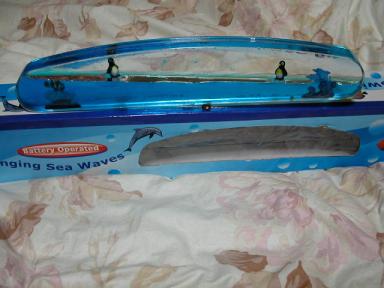 実は20年以上探し求めていた品物があって、先日に近所の雑貨店で偶然に売ってるのを見て、衝動買いしました。しかし、うちが探し求めてた物とは違うが、もし、どなたがお持ちか、情報がありましたら是非お願いします。探し求めた物は、商品名は分かりませんが、ネットで調べてみると「ボトルウェーブ」と言う名前だそうです。近所の雑貨店で偶然に売っていたボトルウェーブ?です。左右揺らすと波になってペンギンがサーフィンしていますwwうちが探し求めているのは、1m近くある長方形のガラスケースの中に船が浮かんでるボトルウェーブです。20年以上前に藤子不二雄の作品の「ブラック商会 変奇郎」と言うマンガの中に「夢の船旅」と言うタイトルかと思うけど、その内容にボトルウェーブを紹介されて、ちょっとブームになっていた記憶がありました。当時、新宿駅か池袋駅かどっちか忘れたけど、構内に雑貨店があって、その1m近くある長方形のガラスケースの中に船が浮かんでるボトルウェーブが売られていて、すごく欲しかったが10000円だったために、持ち合わせが無く、次の日に買いに行ったらすでに売り切れになって、悔しい思いがありました。以来にこの商品を探していたが未だに見つからない・・・・・今でもすごく欲しいので、持ってる人やどこで売っているのかなどの情報を求めています。お持ちの方は交渉にて買いますので宜しくお願いします。ドォゾ(シ・ω・)シ ((o_ _)oョロシク