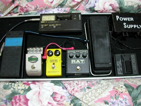 今年もあとわずかですね・・・・・うちはまだ勤務中・・・・・・_| ̄|○ ガクッ・・・気分転換にパソコンいじっていますwwうちが愛用しているエフェクターを紹介しましょう。と言っても、大した物じゃないけどね。ギター弾きならこれを見て、なんだ~と思うが、現行に売っているものとは違います。マーシャルのコーラス以外は80年代のエフェクターで、回路は全く違います。ワウペダルはダンロップのクライベイビーじゃないの?と言われるが、うちのはイタリア製のJENのクライベイビーです。このワウペダルじゃないと、当時の音が出ません。ジミー・ペイジもランディ・ローズもエリック・クラプトンも皆、このワウペダルを使用されています。今はもう絶版になっていて、貴重な存在になっています。黄色のエフェクターは、MXRのディストーション+ですが、現在も販売されていますが年代によって、音は全く違います。これはあのランディ・ローズが使っていたことで有名なディストーション+で、ランディ・ローズの音を追求したいのなら、80年代のディストーション+のLED無しを使うとランディ・ローズの音になります。うちのは80年代だけど、ランディ・ローズにこだわっていないし、マーシャル・アンプの歪みを補うためにブースターとして使うのでLED有りにしました。まぁ、回路が同じでLEDがあるかないかだけだけどね。黒い四角のエフェクターは、プロコのラット2でICがLM308Nを使用されている初期のラットです。LM308Nはかなりの低音に歪むし、サスティーンも素晴らしい。現行モデルはLM308Nを使用されていないので、音が全く違います。うちは聖飢魔2などにほとんどこれをメインで使用しています。シルバーのエフェクターは、マーシャルのコーラスで現行に売っているものですww曲によって、コーラスを使うことがあるし、コーラスだけではなく、フランジャー、フェイザーも入っているので、ヴァン・ヘイレンの時に使いますwwあとはヴォリューム・ペダルとチューニングメーターとパワーサプライです。写真にありませんが、ラックタイプのエフェクターのリヴァーブとデジタル・ディレイの2機設置してありますので、フットスイッチで操作します。ギター弾くとなにかが物足りなくなったり、音が気に入らなかったり、色々と問題発生してしまうので、納得行くまで莫大な投資しています。うちは何十年の間だけでも、ギターを含めると2000万円ぐらい掛かっています。バカか?と思われるけど、こだわりある人はそこまで惜しまずに投資すると思います。趣味に投資することはいけないことではないと思いますけどね。バイクだって、車だって、ブランドだって、なんでもそうじゃないかな?好きなことを自己満足の世界ですよ。力説してしまったwwさ~て、仕事頑張るか・・・・・