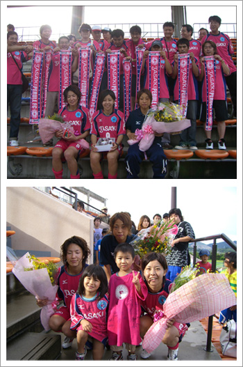 こんにちは!いよいよリーグが再開しました!!私たちペルーレは再開初戦、高槻とアウェーで戦いました。最近はかなり涼しかったのに、いきなり夏を思い出したかのような気温になり、猛暑のなか試合が始まりました!観にきていたお客さんもかなり暑かったと思います(^o^;試合は前半ペルーレがボールを回すけどゴールまでいかずに、高槻がカウンターで攻めるみたいな感じで進んでいきました。そしてそして、ゴール前で味方が倒されフリーキックのチャンス。『最初だから蹴ってみるわー』と一言いってボールをセット。思い切って蹴ったらそれが入ってゴ~~~ル!!!久々の得点だったのと、みんなも喜んでくれてうれしかったです!!(^^)v二点目もセットプレーから入って、あと1点取ってハーフタイムに入りたかったけど、奪えず後半へ。1点入れられて、前期なら嫌なムードになっていたかもしれないけど、今のチームは前に行こうとする気持ちが強いから、しっかり3点目、4点目を取れたんだと思います!!私もチャンスが沢山あったのに決めれなかったし、パスミスからカウンターを食らった場面もあったからもっとミスを減らさないと。(・・;)高槻ではこの日2試合行われたのですが、2試合目のINACvsベレーザ戦を私と磯さんがビデオ撮影していた時のこと。普段やらないからわからなくて、最初の15分くらい撮れてないし、前の人の後頭部が入るし、興奮して声入っちゃうしで散々でした(^o^;前のおじさんの後頭部をどう回避するか考えた結果、そっち側にボールが行ったときは三脚ごと浮かして撮っていました。(^o^;三脚をもう少し伸ばせば良いことに気付いたのは後半のロスタイムに入ってから!!笑い声と叫び声の沢山つまった楽しげな(?)あやしい(?)ビデオになっちゃいました!(^o^;そういえばもうすぐ9月9日になるなぁ~。それがなにかというと、私とそっくりの母の誕生日!!正確に言うと私がそっくりなんですけどね。関西での試合はいませんが関東なら大体来てるので探してみてください(^-^)まぁすぐわかります!!母はあまりサッカーを知らないからボールがゴールに入ってハーフラインにボールが戻されると『入ったのに何でっ!!』と言って周りの人を困らせます!水筒に日本酒つめてくるし(・・;)でも来るのが楽しみみたいなので何も言わないようにしてますが・・。見つけたら『素敵なパーマですわぁ』と言わないでくださいね!天パ~ですから(^o^;