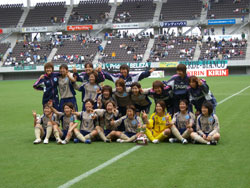 報告がありま~す。ベレーザとの1戦!『なでしこスーパーカップ』に優勝しました~!!(^^)vやる前はびびりはしないけど、さすがに2年くらい勝っていない相手だったからどうなるのか不安な気持ちで、わらにもすがる思いというか、何かに頼りたくて、頼ったものが、前日にコンビニで買ったこれです!『酸素5倍』とかかれた水です。しかもこれを買っていたのがチームの年長者ベスト5でした。(^o^;(写真にはいないけど鈴木選手も持ってます)ベテランほどビビってると言ってみんなで笑っいました。千葉のフクアリで行われた試合、前半こちらにチャンスが多かったけど決めきれず後半に。そしてペルーレに待望の1点がっ!!やばいくらい嬉しかったですね~!!しかしそのあとがさすがベレーザで、すごい攻撃の数々・・・(・・;)時計は何回観ても進まないし、相手の攻撃は勢い増すし、もーやば かったです。いつ入れられちゃうかってくらい。そして終了のホイッスル!1ー0で終わった瞬間、嬉しさもあったけどホッとした気持ちが強かったぁ~!みんなでとった久々すぎるタイトル!! 喜び方も忘れてました(^o^;これでリーグも波に乗っていきたいです!!あと最後に、後半に私のシュートがオフサイドになったシーンがあったんだけど、あれは絶対違~う!!(`´)私の独り言でした。最後に貴重な1点を叩きだした鈴木選手の右足をちゃんと磨いておきました(^^)v