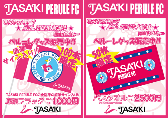 モックなでしこリーグ オールスター 2006のファン投票では、多くの皆様に投票して頂き、選出していただきました。ほんとうにほんとうに有難うございます。凄く凄く嬉しいです。私自身、とても 楽しみにしています。応援よろしくお願いします。ちょっと宣伝になりますが、当日 国立競技場でペルーレグッズの販売があります。関東地区での販売は、あまりないのでぜひみなさま、この機会に如何でしょう?私のオススメ商品はなんといっても「全選手直筆サイン入りの応援フラッグ」です。全員でサインしましたよ~それともう一つ、新商品「バスタオル」はひざ掛けや座布団代わりにも使用できて便利!。う~ん 携帯ストラップ・クリーナー・・・・・結局、全部可愛いので全部オススメですね(^。^)<8月27日(日) 国立競技場 モックなでしこリーグ オールスター 2006>TASAKIペルーレFC グッズ販売 17:00(開門)~ 18:50頃販売終了メインスタンド側 コンコース付近 (千駄ヶ谷門近辺) ≪TASAKIブース≫にて ☆ 全選手直筆サイン入り 応援フラッグ /1000 限定100本 下写真参照: 田崎POPフラッグS(2006 all star用l) ☆ NEW!! バスタオル /2500 限定50枚 下写真参照:田崎POPバスタオル(2006 all star用l) ・タオルマフラー /1500 ・携帯ストラップ /500 ・携帯クリーナーストラップ /500 ・シールセット /300 ・バンパーステッカー /500 ・ユニホーム型抜き扇子 /500 ・アクリルユニホームキーホルダー /500数に限りがありますので、お早めに!!